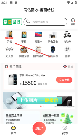 1、进入【爱估回收】首页,点击【手机】分类入口,进入回收品类的品牌选择界面。