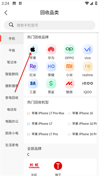 2、在回收品类页面,选择对应的品牌选项。