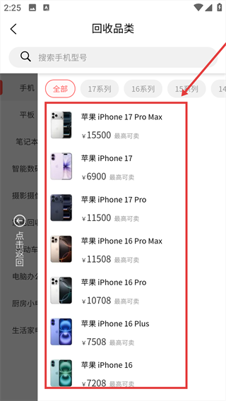 2.在弹出的机型列表中,精准选择需要回收的手机型号。
