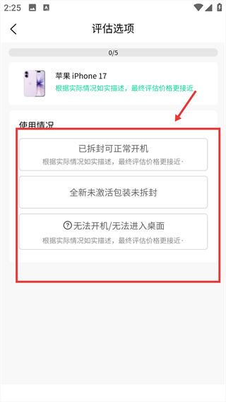 3.按照软件提示,如实选择手机的外观成色、功能状态等相关内容。