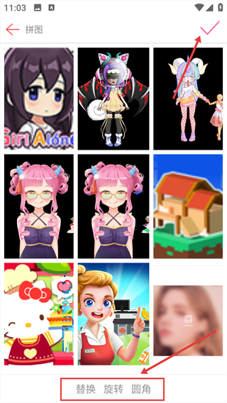 3、进入编辑页面,可通过【替换】【旋转】等功能调整图片,完成后点击右上角确认按钮。