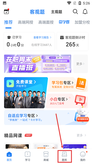 1、在主页面底部,点击【题库】按钮切换至题库板块。