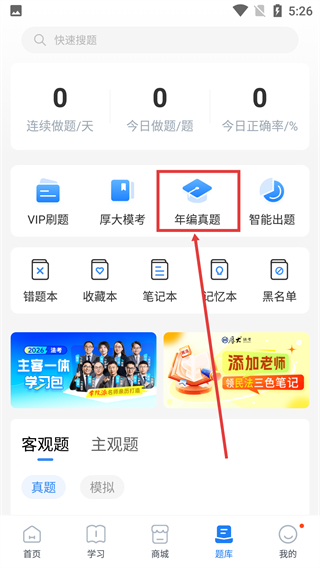 2、进入题库页面后,选择【年编真题】功能,该功能可查看不同年份的真题卷,页面还显示做题相关数据。