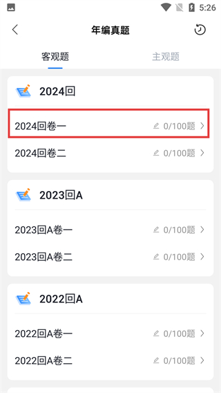 3、在年编真题页面,选择【2024回卷一】真题卷,该试卷有0/100题待练,点击可进入对应答题环节。