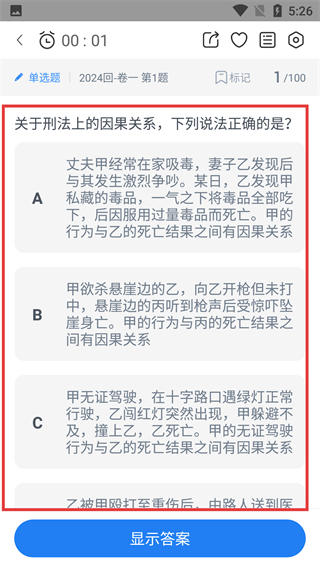 4、进入答题页面后,可做【2024回-卷一第1题】单选题,完成选择后,点击【显示答案】可查看题目解析。