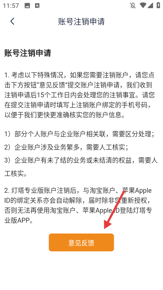 4、在账号注销申请页面点击【意见反馈】,提交账号注销申请。