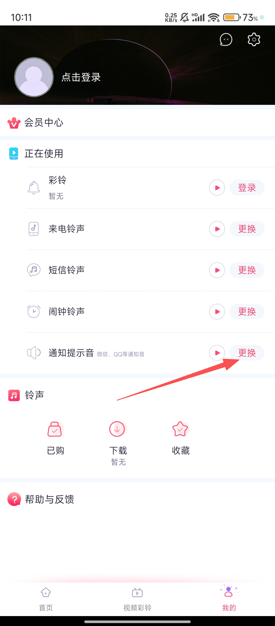 2、在个人中心页面,找到【通知提示音】右侧的【更换】按钮点击,进入更换页面哦。