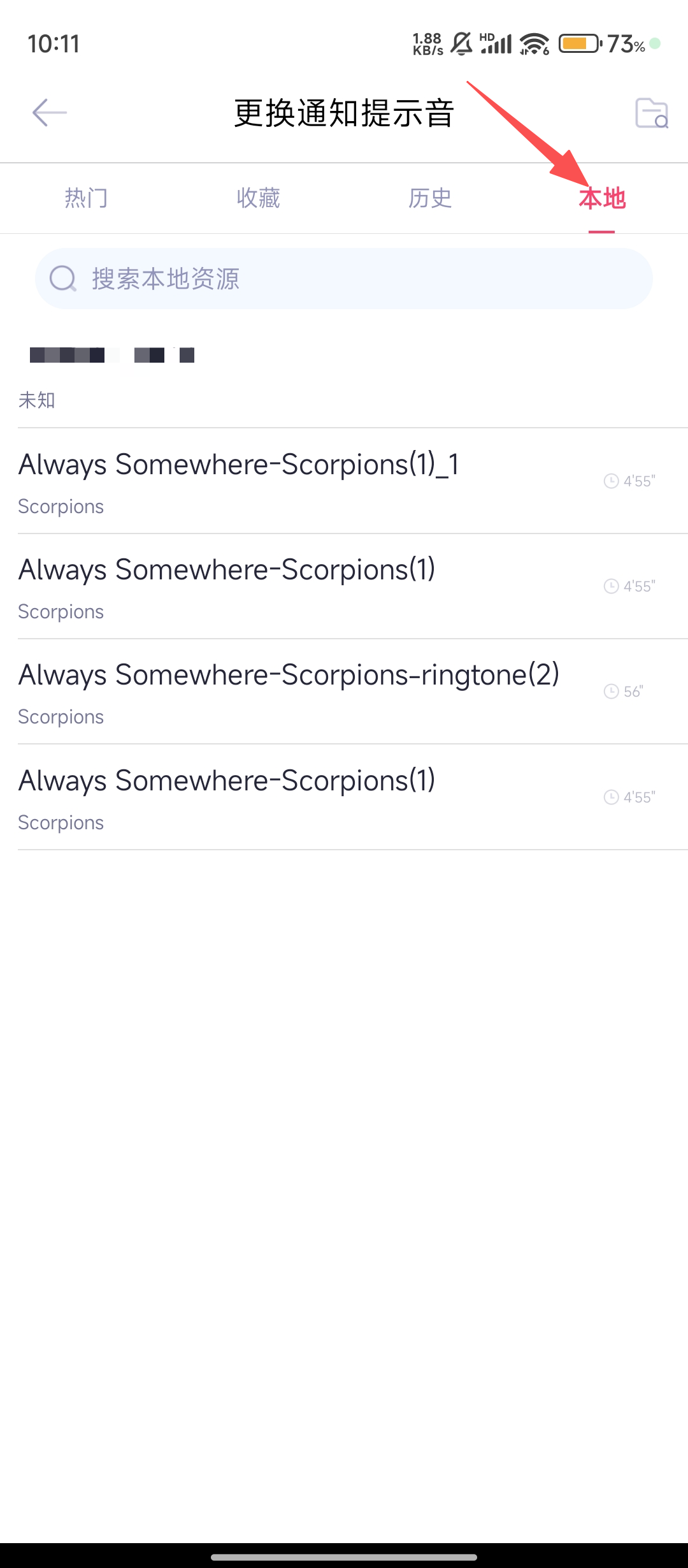 3、在更换通知提示音页面,点击【本地】标签,查看手机本地的铃声资源呢。