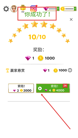 4、完成任务获得【10/10】满星评价后,领取【钻石】【金币】奖励。