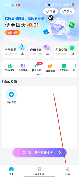 1、打开应用隐藏计算器首页,找到底部导航栏的我的选项,点击进入个人页面。