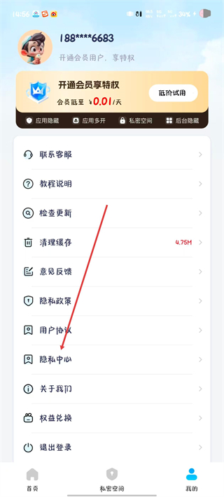 2、在个人页面列表里,找到隐私中心选项,点击进入隐私相关的设置界面。