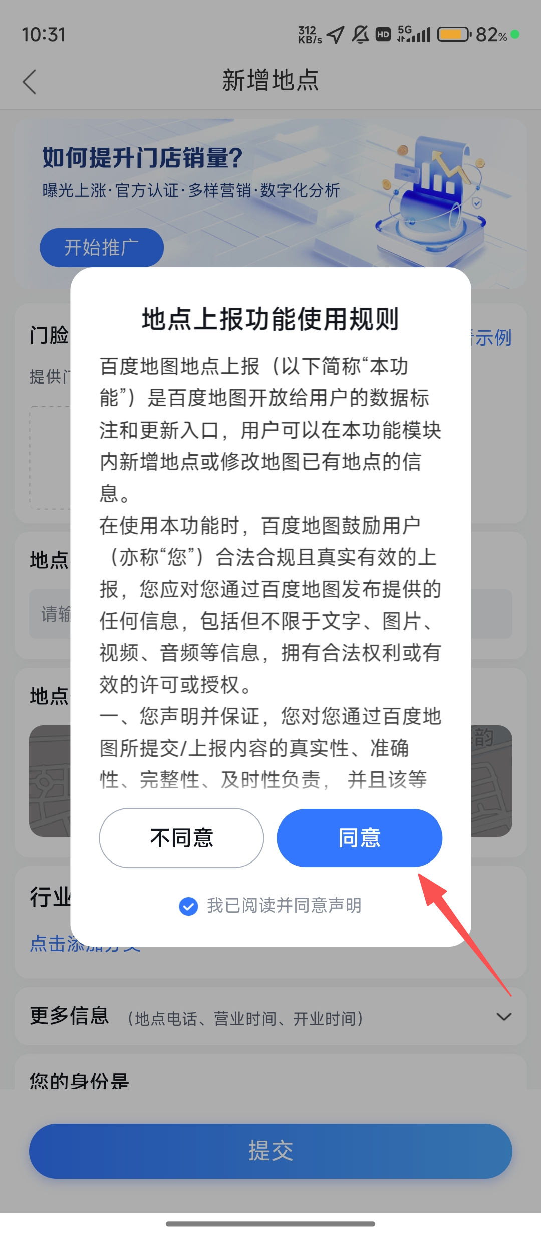 3、进入新增地点后,点击【同意】-【地点上报功能使用规则】,遵守规则后可继续填写店铺信息,这一步可别跳过哦。