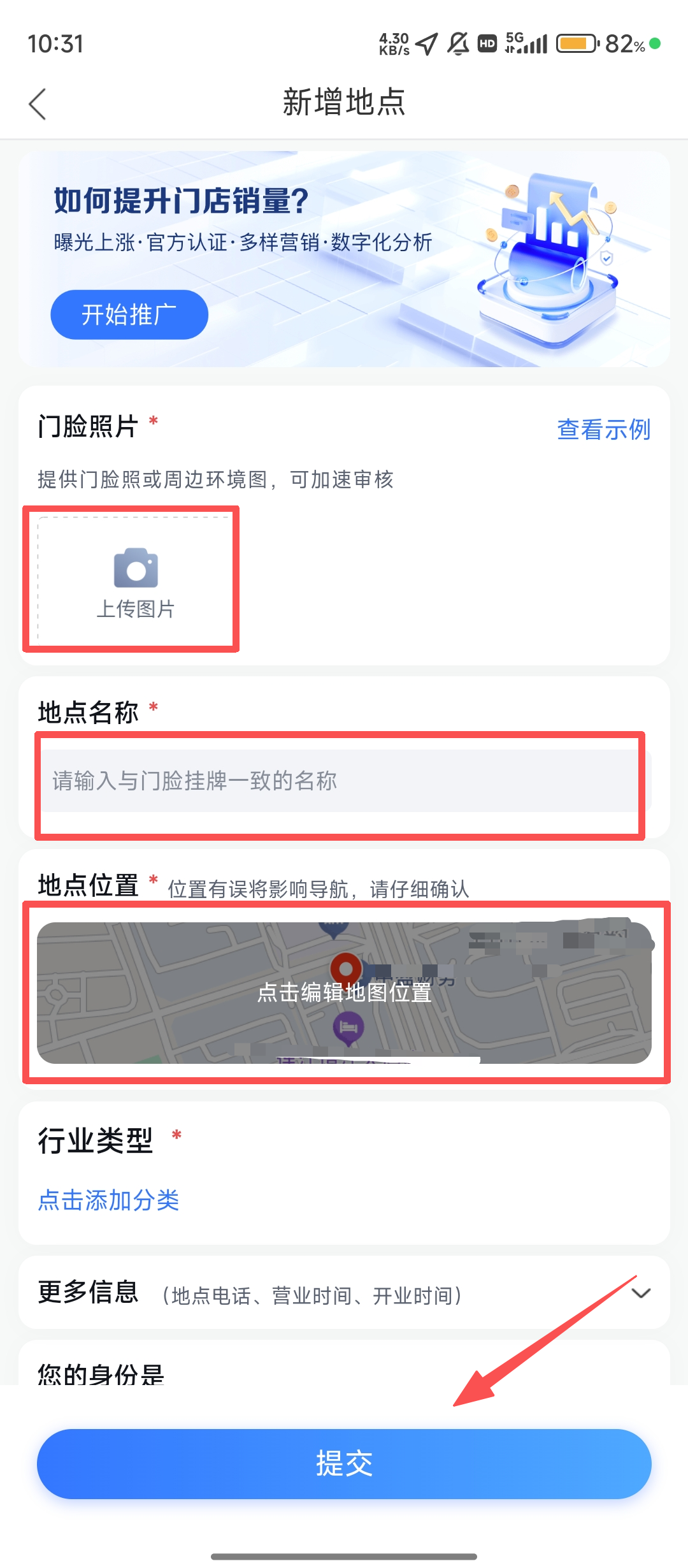 4、在新增地点页,上传门脸照片,输入【地点名称】,确认【地点位置】,选好行业类型后点击【提交】,店铺位置添加就完成啦。