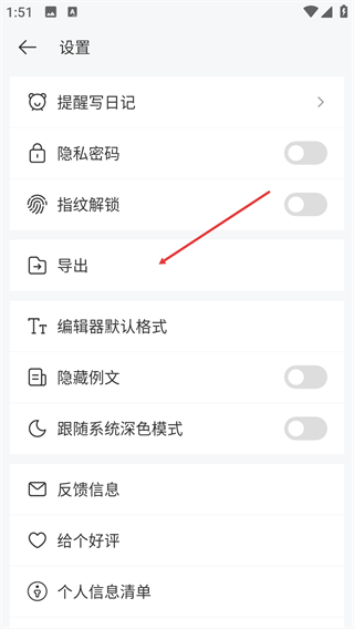 3、在设置页面,选择【导出】选项,进入日记导出的配置页面。