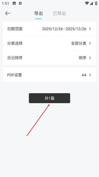 4、确认日期范围、分类选择、日记排序、PDF格式等参数,完成导出操作。
