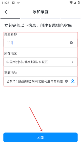 2、填写房屋名称、所在地区、家庭地址等信息,完成后点击“添加”按钮。