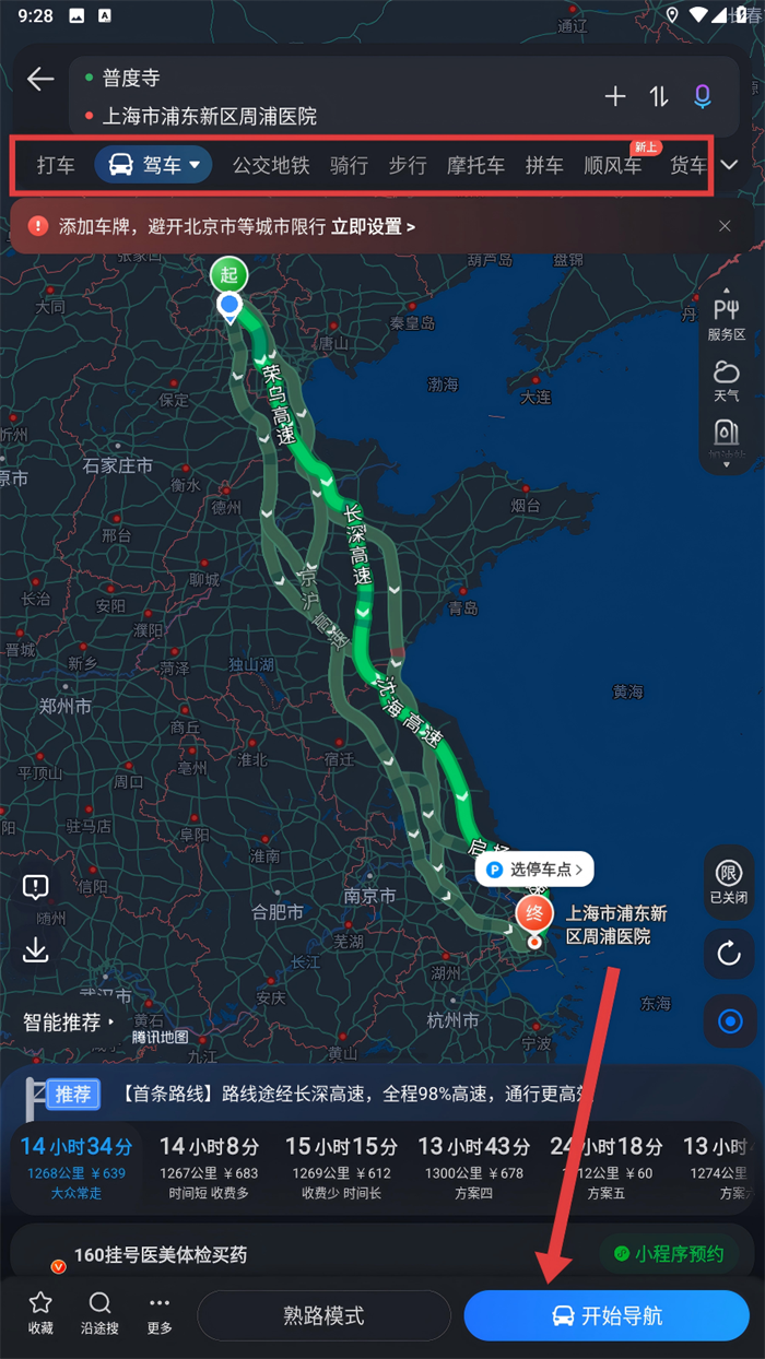 4、选好【驾车】等出行方式后,点击【开始导航】,腾讯地图就会为我们规划最优路线,助我们顺利抵达目的地呀。