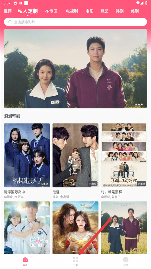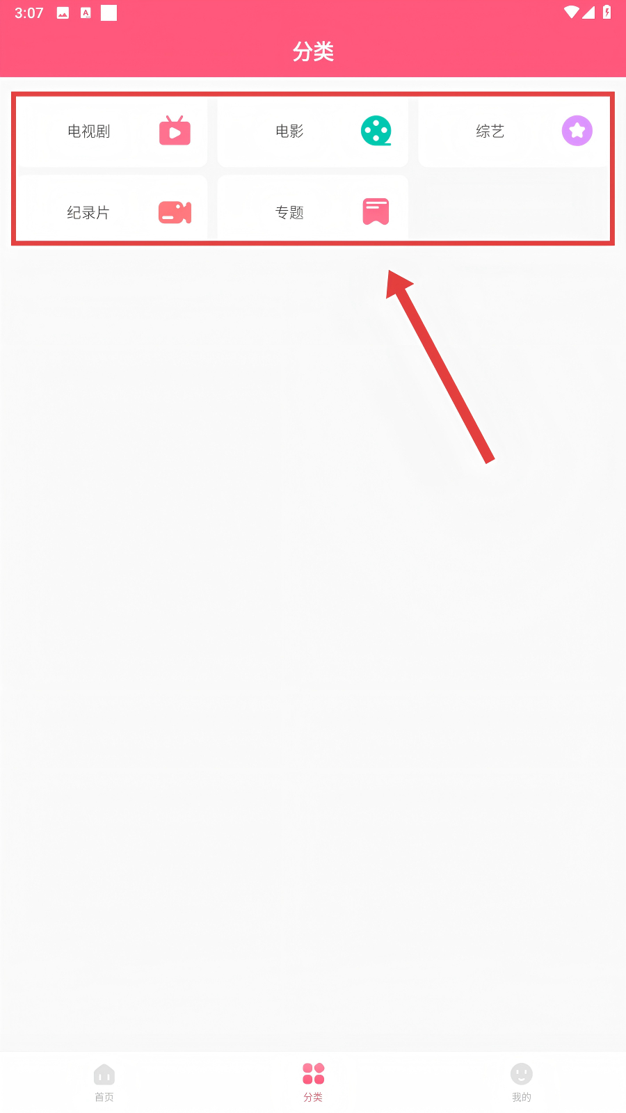 1、打开软件,在首页下方点击【分类】按钮,就能进入影视分类界面,方便咱们筛选想看的内容哟。
