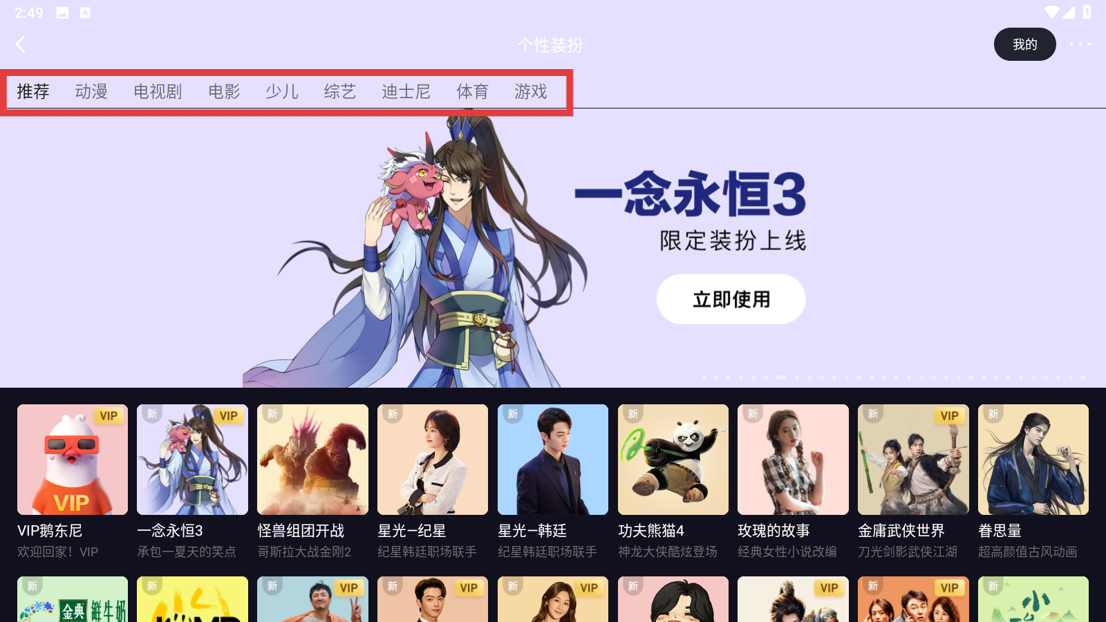 3、然后我们就能看到【推荐】、【动漫】、【电视剧】等分类标签,选择偏好的分类去找喜欢的装扮吧。