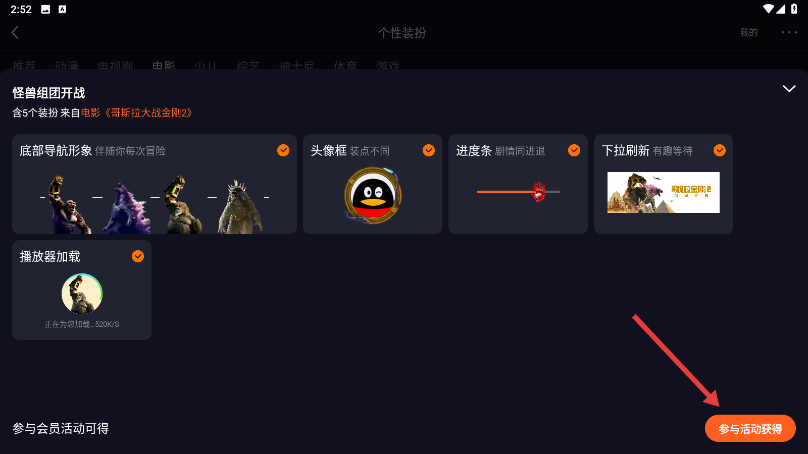 4、看到喜欢的装扮后,比如【怪兽组团开战】这类,点击右下角的【参与活动获得】按钮,去获取并设置对应的个性装扮啦。