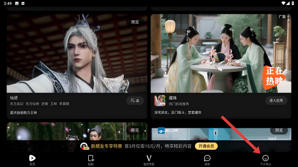 1、打开【腾讯视频】,进入主界面后,点击右下角的【个人中心】吧。