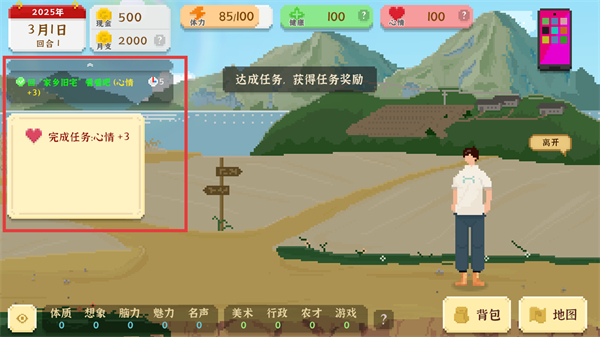 3、完成【家乡旧宅】任务后,获得【心情+3】奖励,继续推进其他游戏内容。