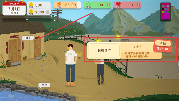 4、选择【改造旧宅】选项,消耗【体力30】,可获得【农具】-【临时仓库】,【体质+20】且【想象+10】,提升角色能力。