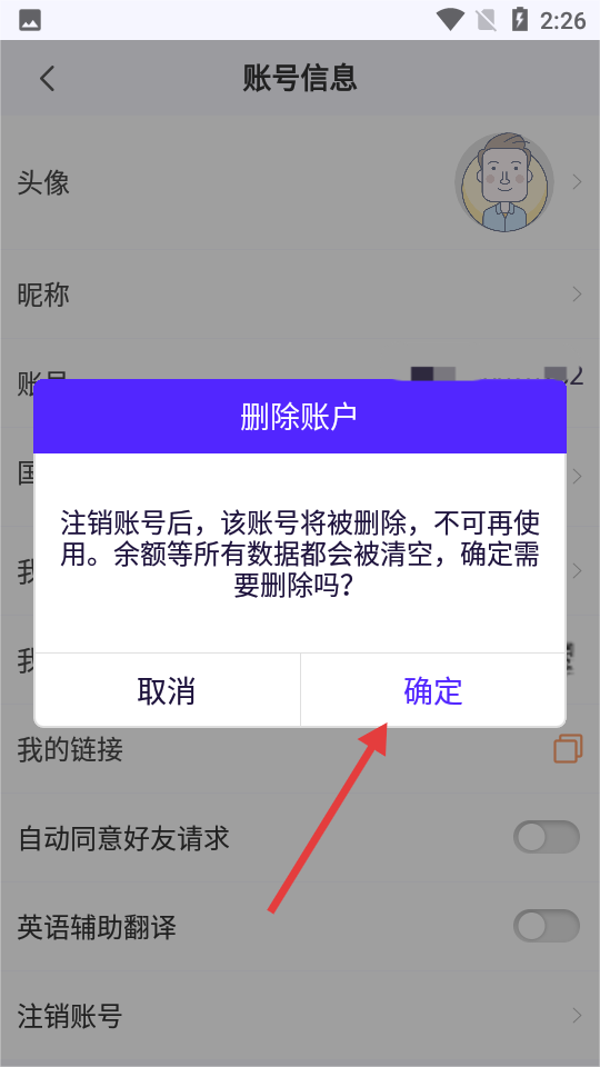 3、在账号信息页面点击【注销账号】,弹出删除账户确认框。