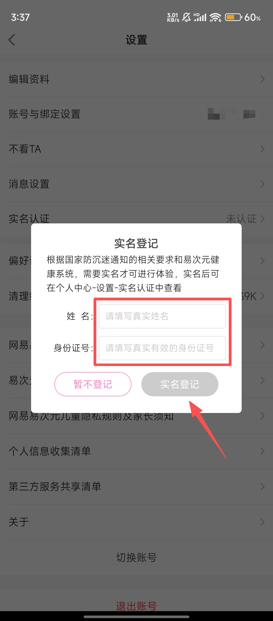 4、在实名登记弹窗中,填写真实姓名和身份证号,点击【实名登记】,就能完成实名认证修改啦。