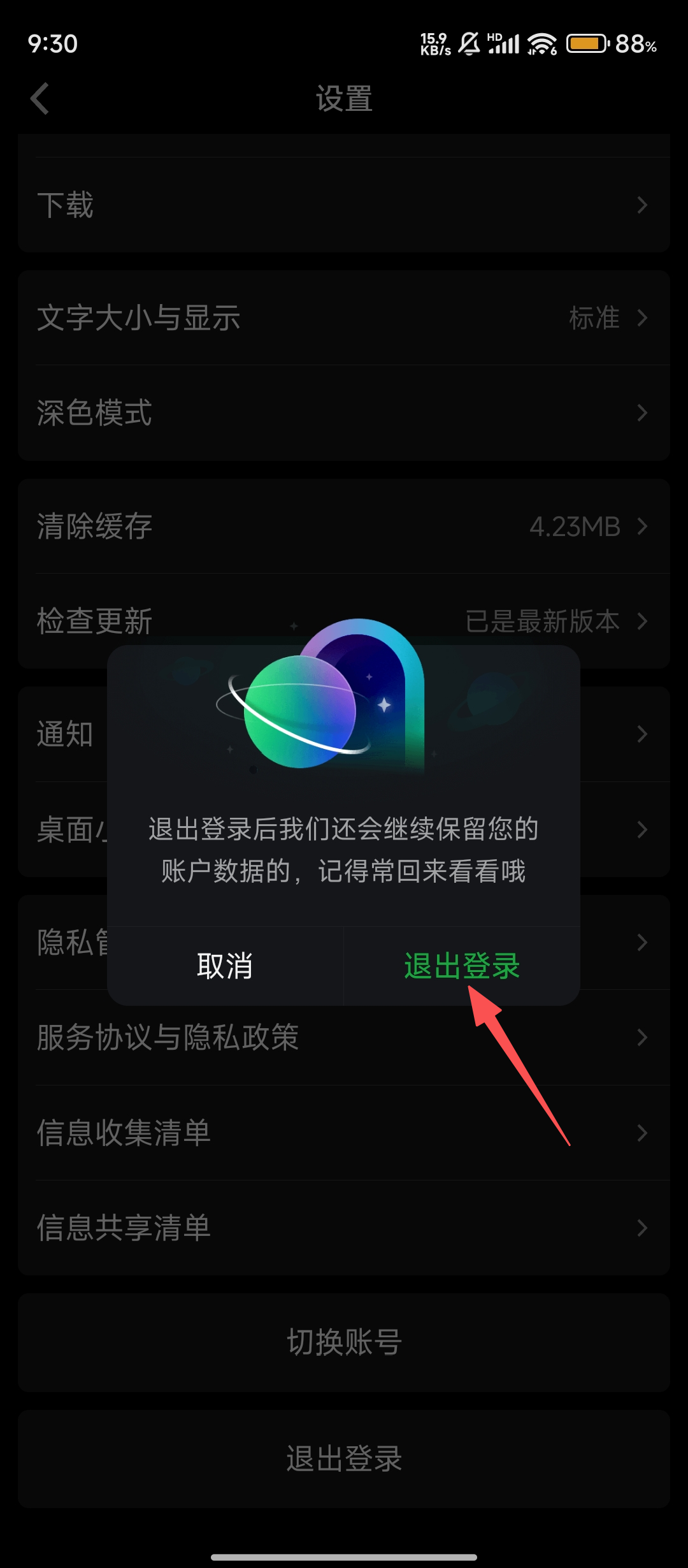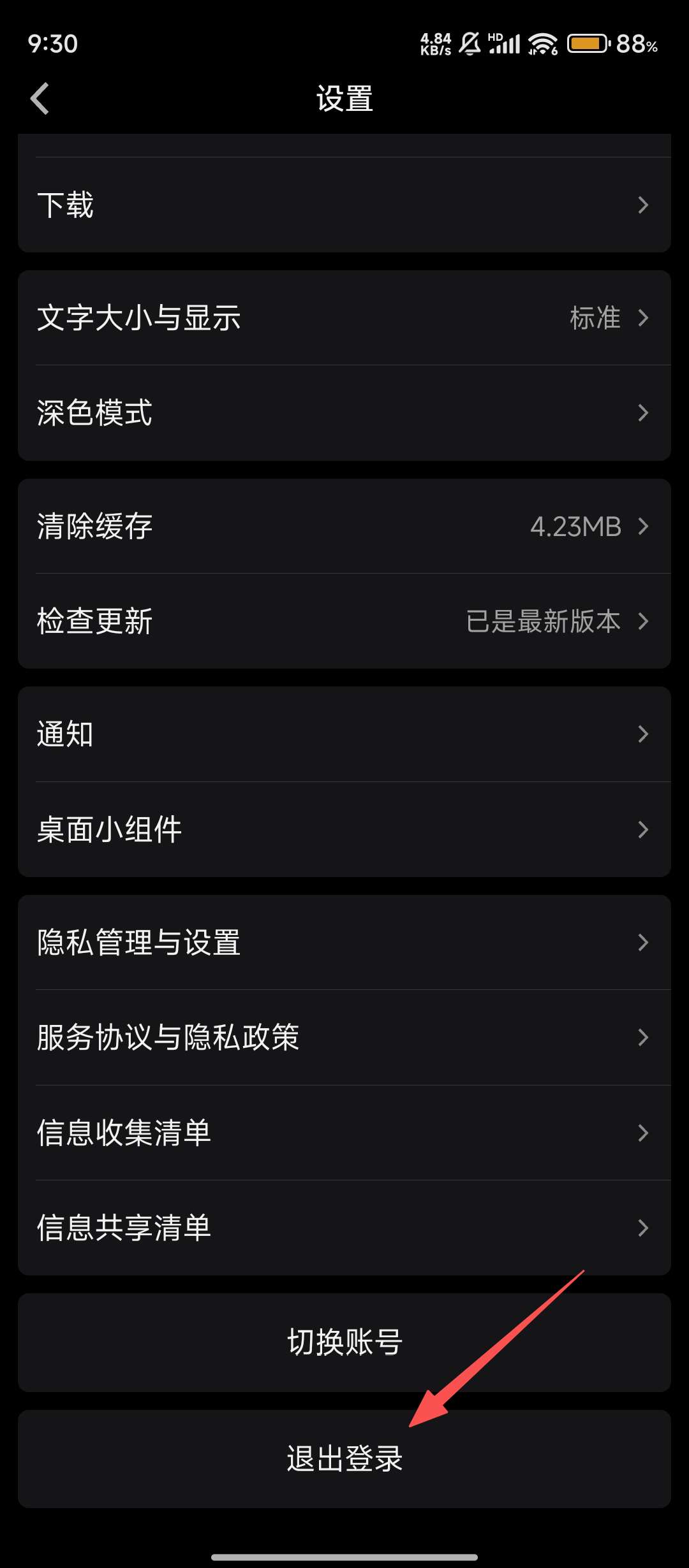 3、在【设置】页面里,一直往下找,就能看到【退出登录】按钮啦,点击它就会弹出确认框咯。