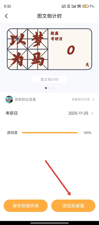 4、进入【图文倒计时】页面,可调整【透明度】,设置完成后,点击【添加到桌面】即可将该组件放到手机桌面。