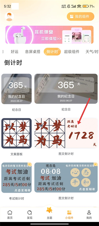 3、点击【倒计时】分类,可看到【纪念日】、【考试倒计时】等组件,选择心仪的组件样式进行后续操作。
