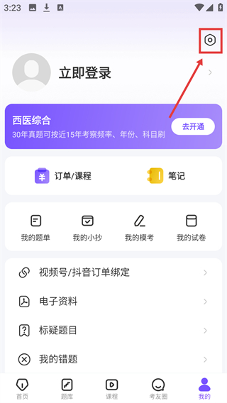 2、进入【我的】页面,看到【立即登录】等模块后,点击右上角的【设置】图标,进入设置功能页面。