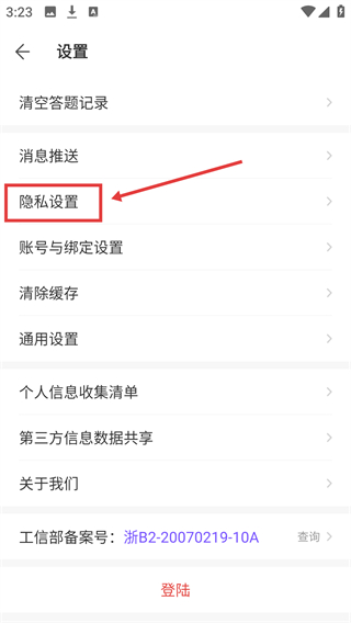 3、进入【设置】页面,找到功能列表中的【隐私设置】选项,点击该选项进入隐私相关设置页面。