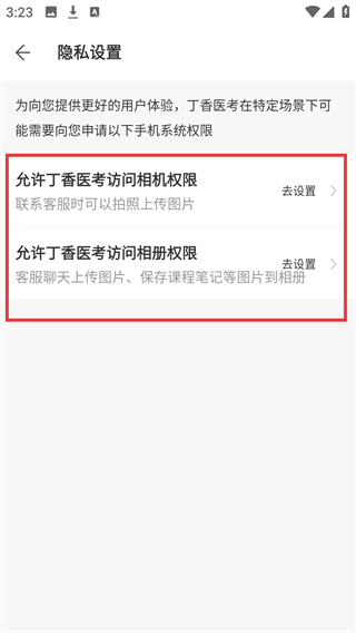 4、进入【隐私设置】页面,可看到【允许丁香医考访问相机权限】等选项,点击“去设置”可配置对应权限。