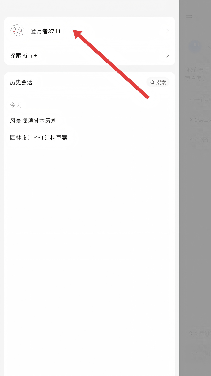 1、打开Kimi,点击昵称区域进入个人设置入口,开启手机号换绑的操作流程呀。