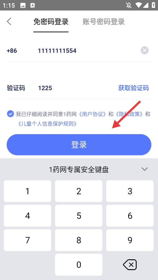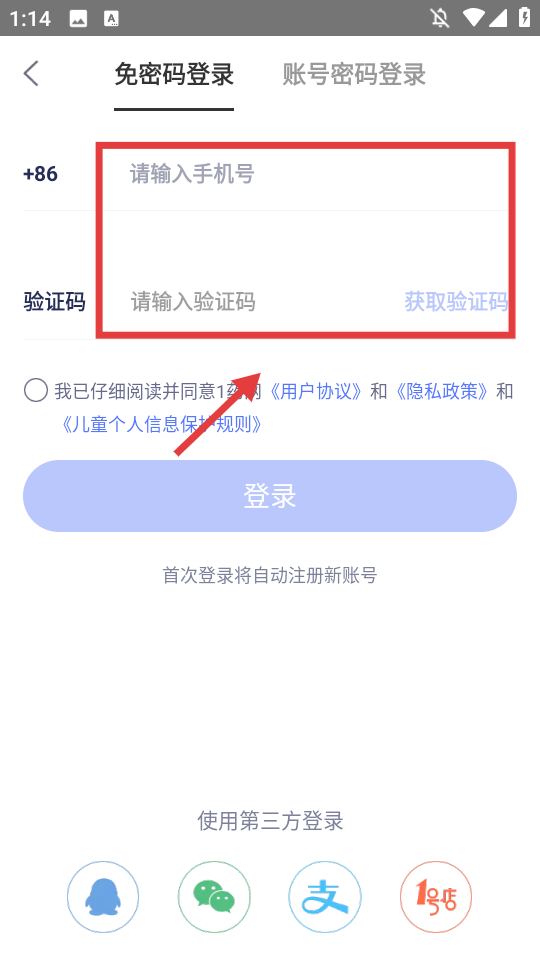 3、在免密码登录界面输入手机号,获取并输入验证码。