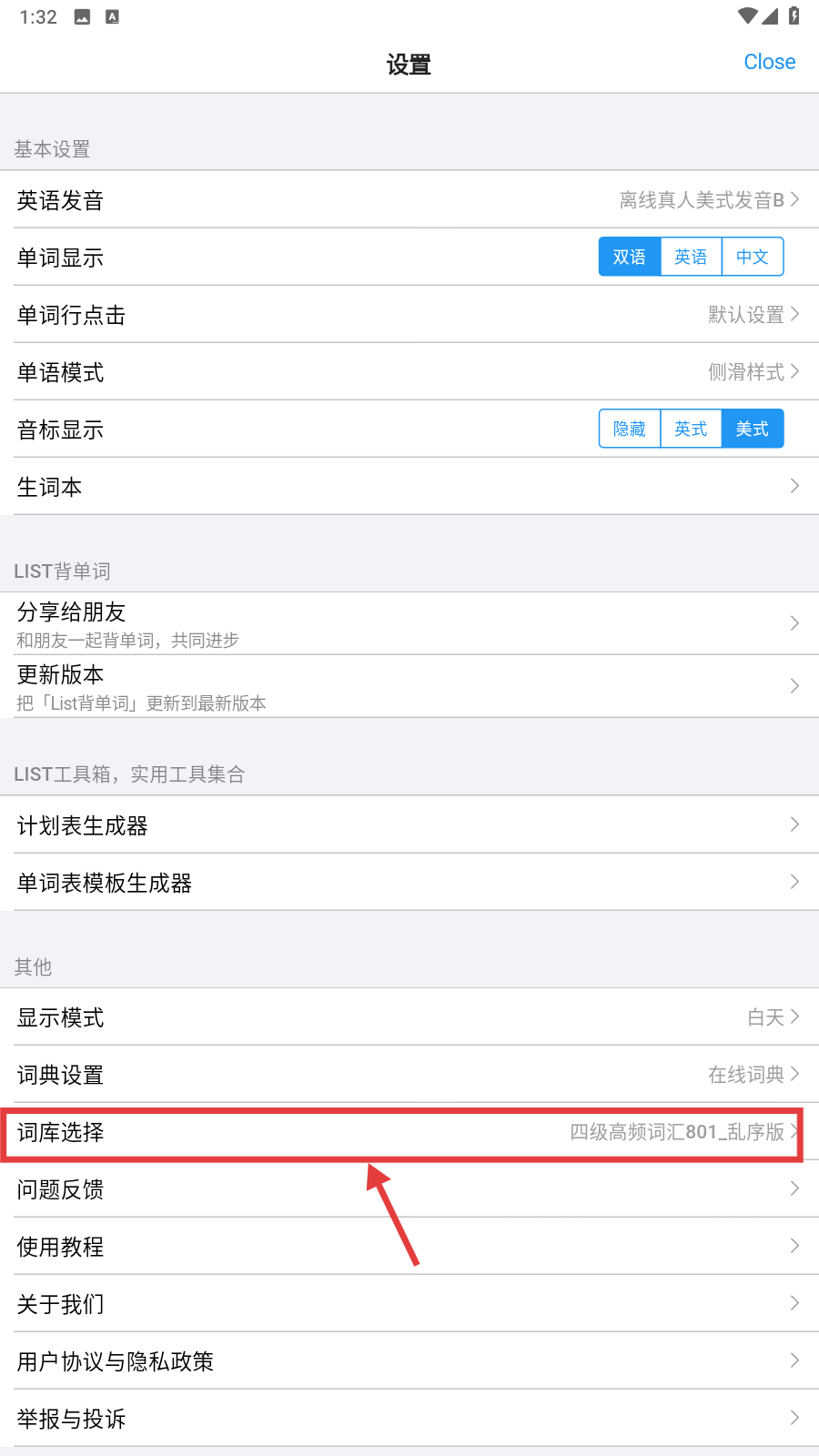 1、我们打开【List背单词】app,进入【设置】页面,找到并点击【词库选择】选项,进入词库设置界面。