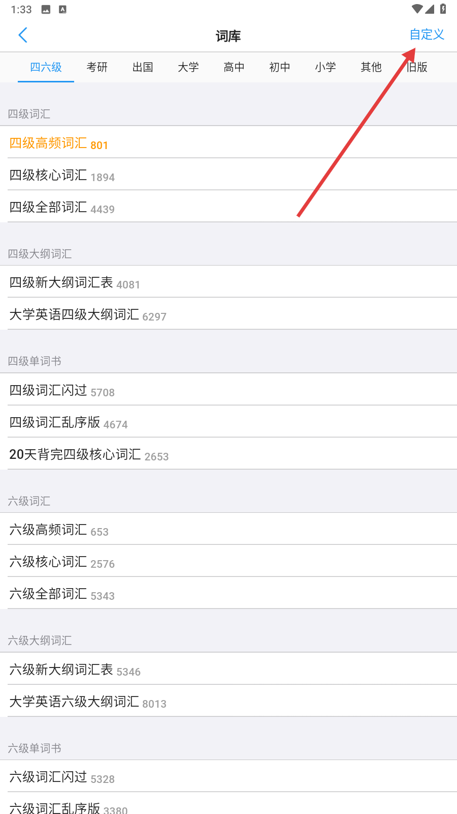 2、在词库界面,点击右上角的【自定义】按钮,弹出导入方式的选择窗口。