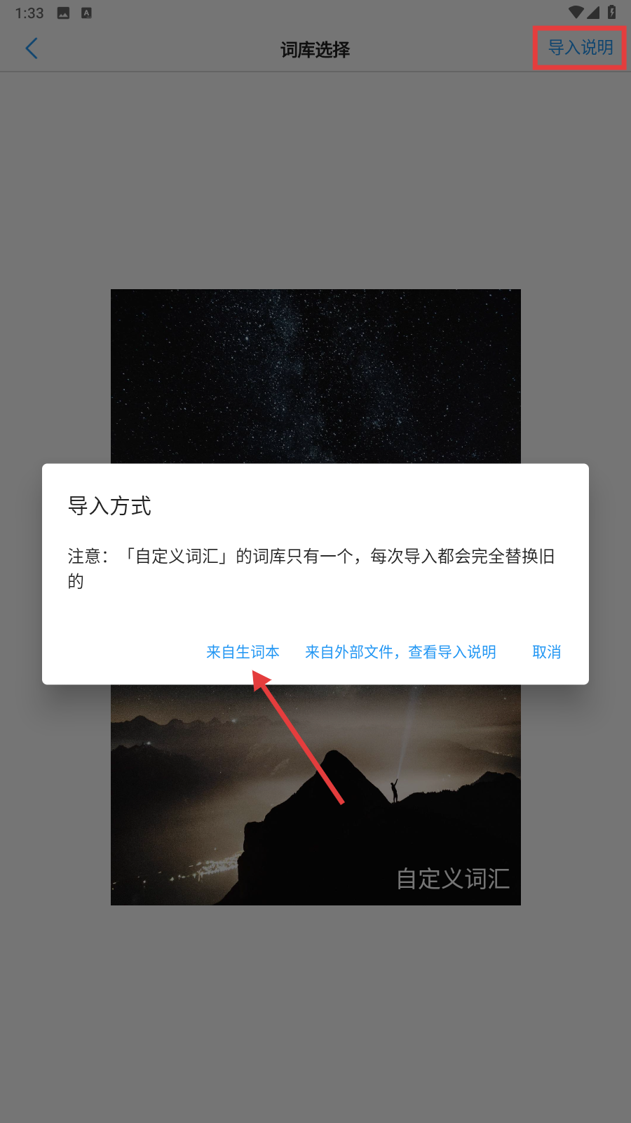 3、在弹出的窗口中,选择【来自生词本】的导入方式,按照提示进行操作。
