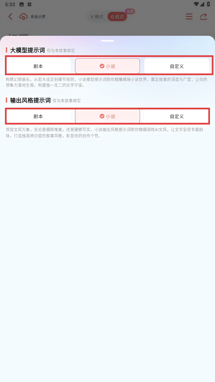 彩云小梦内置多种续写风格——脑洞大开、细节狂魔、言情、玄幻、纯爱,点击创作页面下边栏自由切换,可续写不同风格的内容。还有V2版专业模型等来体验。