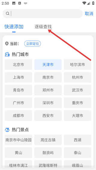 2、在城市选择页面,点击【逐级查找】选项,切换到逐级查找的城市选择模式呀。