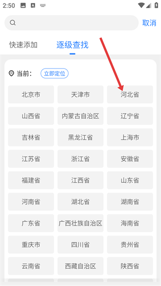 3、在逐级查找页面,找到并点击【河北省】,进入该省份的城市列表哦。