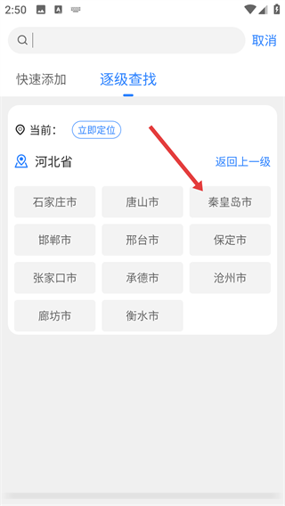 4、在河北省的城市列表中,点击【秦皇岛市】,即可完成该城市的添加,方便查看当地天气啦。