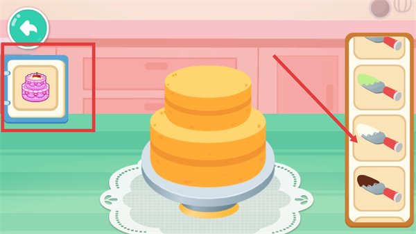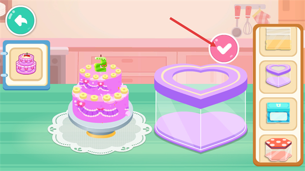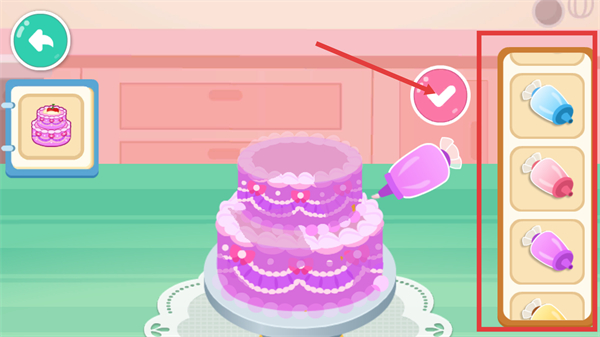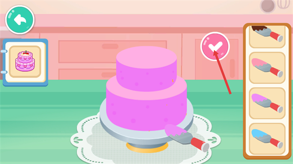 2、蛋糕胚涂抹完毕后,点击界面的【粉色对勾】按钮,确认当前步骤,解锁下一个装饰环节。