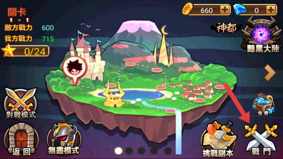 1、进入游戏界面,点击箭头所指的【戰鬥】按钮开启战斗。