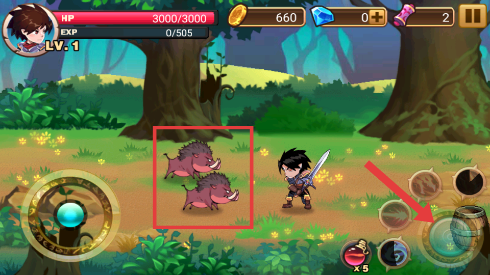 2、遭遇红框内的野猪敌人时,通过点击屏幕右侧箭头所指的攻击按钮,操控角色进行攻击。