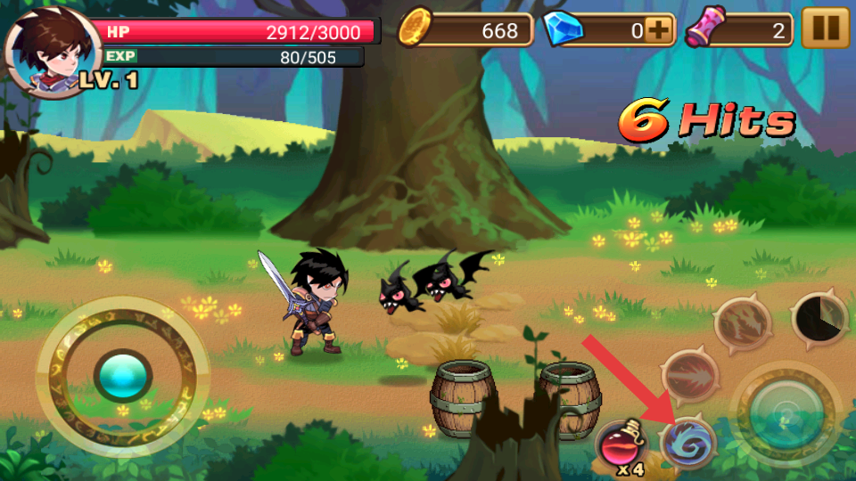 3、战斗中,当技能冷却结束后,点击箭头释放技能进行攻击敌人。