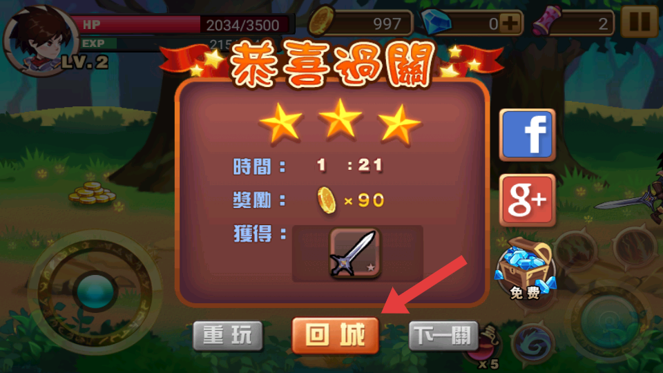 4、成功通关后,点击【回城】按钮,回到主界面进行强化升级。