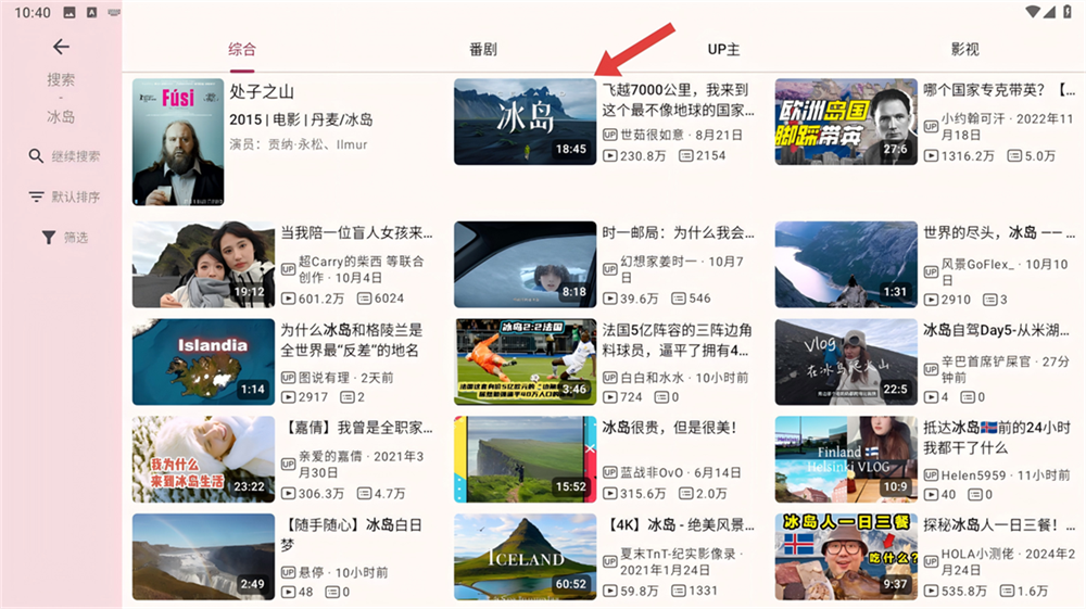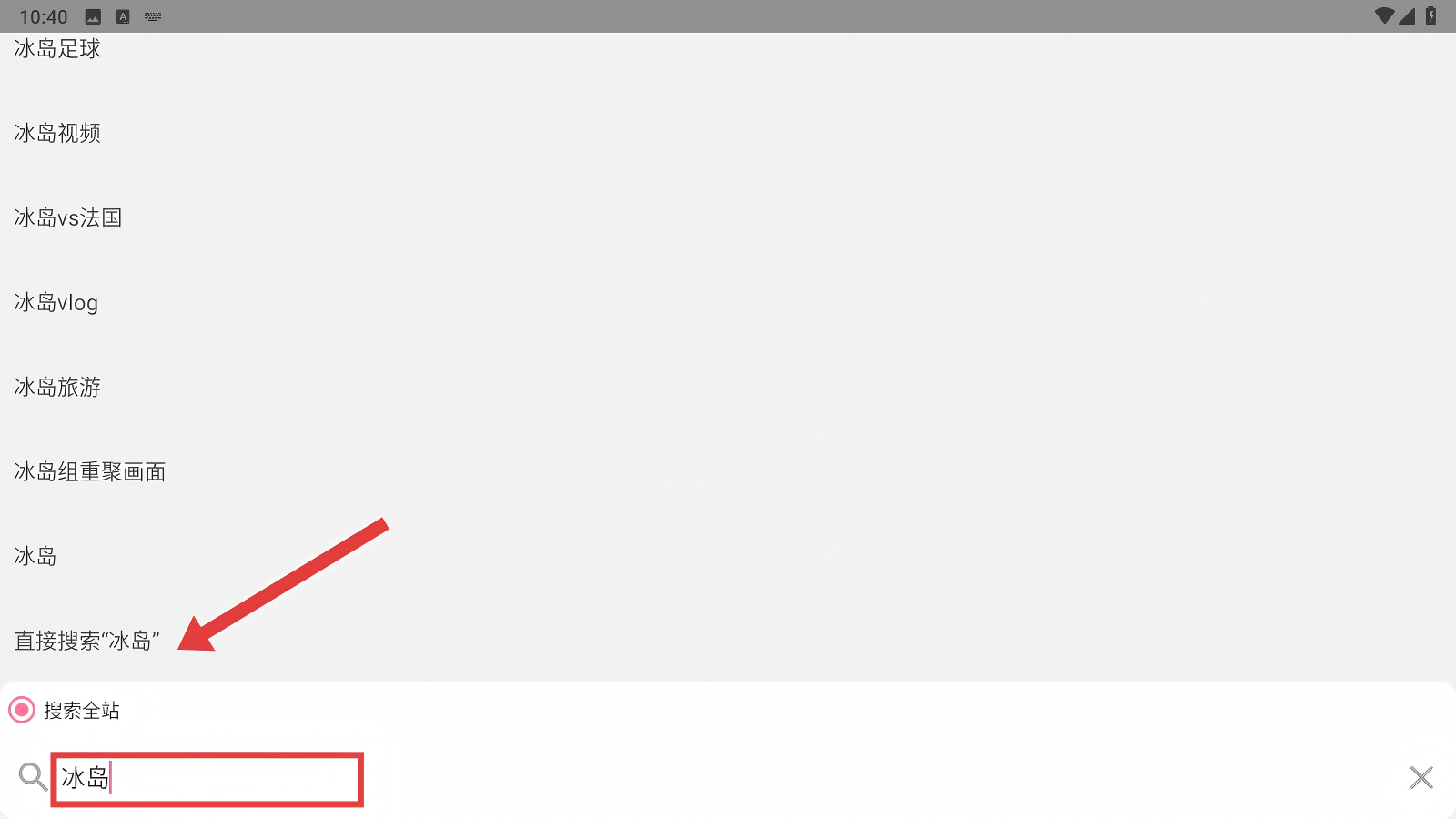 2、进入搜索页后,在搜索框输入想看的内容,比如【冰岛】,能看到相关推荐选项哟。